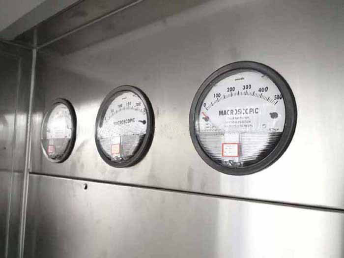 在其旁有壓差計,測試過濾器的阻力在送風箱體的內部還有排風調節板,可以調節設備的排風量在合理的范圍內(設備安裝就位后,由專業人員設試,請勿擅自調整)。