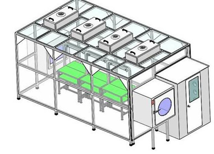 高效過濾器或ULPA高效過濾器及空調送風機組而成為一較高級之潔凈室,其等級為100~10000級,內部空間高度在2-3米左右,覆蓋面積約一般在100平方米以內,四支支柱可加裝活動輪,可為彈性運用。